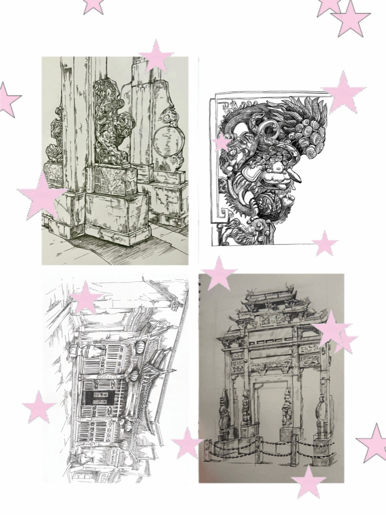 在这次研学中,老师亲身教学,同学们积极学习。通过观察徽派建筑中的装饰纹样,同学们学习到了各种纹样的构成形式和寓意,从传统建筑中的笔笔雕刻到成果成册的排版配色,无不为新学期的装饰纹样设计课打下基础。