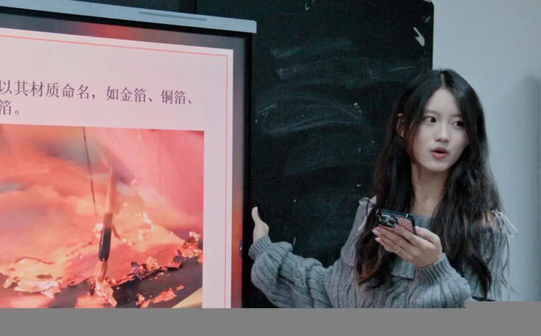 讲解环节特别强调了锡箔画的当代意义。在快节奏的现代生活中,传统手工艺的细腻与专注恰恰为人们提供了一处心灵栖息的港湾。将非遗技艺引入校园,不仅是为了传承保护,更是希望同学们能在传统工艺中寻找到与现代生活的连接点,让古老技艺焕发新的生机。