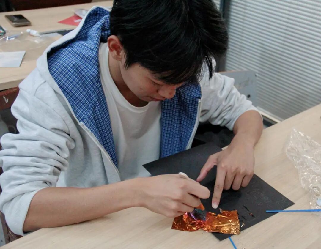 制作环节中,参与者们在协会成员的指导下,逐步学习锡箔画的制作技巧。从图案设计到锡箔裁剪,再到精细粘贴,每一个步骤都需要专注与耐心。教室里,只听见锡箔纸沙沙作响,同学们全神贯注于手中的作品,在描、贴、叠的重复动作中,逐渐进入沉浸状态。